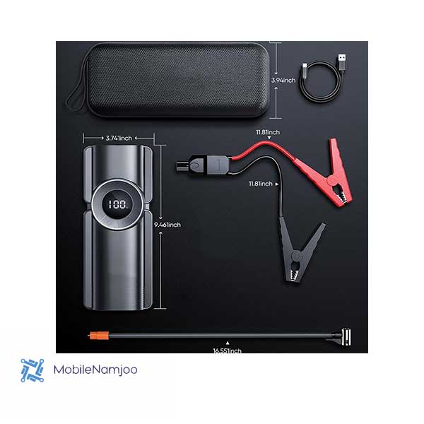 اقلام همراه کابل شارژ،کابلهای اتصال به باتری،شیلنگ هوا،سه عدد نازل برای پمپ باد،کیس محافظ و حمل جامپ استارتر