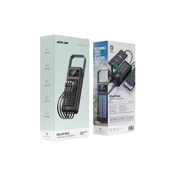 پاوربانک سولار (خورشیدی) گرین لاین محصول جدید با خروجی کابل های متنوع Type C ، Lightening ، Micro USB ،USB-A به کاربر دسترسی میدهد تا طیف وسیعی از دستگاه های الکترونیکی را شارژ کند بعلاوه اینکه خروجی های متنوع دیگر USB نیز بر روی دستگاه طعبیه شده است و می توان به راحتی همزمان از انها بهره برد.